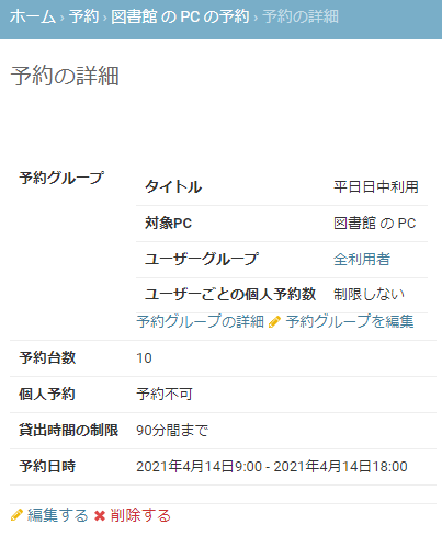 予約グループ内の各貸し出しプランの編集・削除は、予約グループ詳細ページの下部「予約一覧」に列挙されている各貸し出しプランのリンク先にて行ってください。